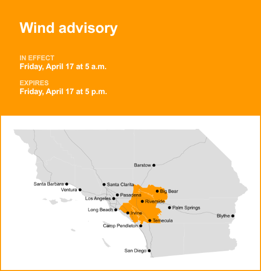 Santa Ana Mountains/Foothills, Orange County, San Bernardino and Riverside County Valleys and San Bernardino County Mountains were placed under a wind advisory by the National Weather Service on Thursday at 11:45 a.m. The advisory is valid for Friday, April 17 between 5 a.m. and 5 p.m.