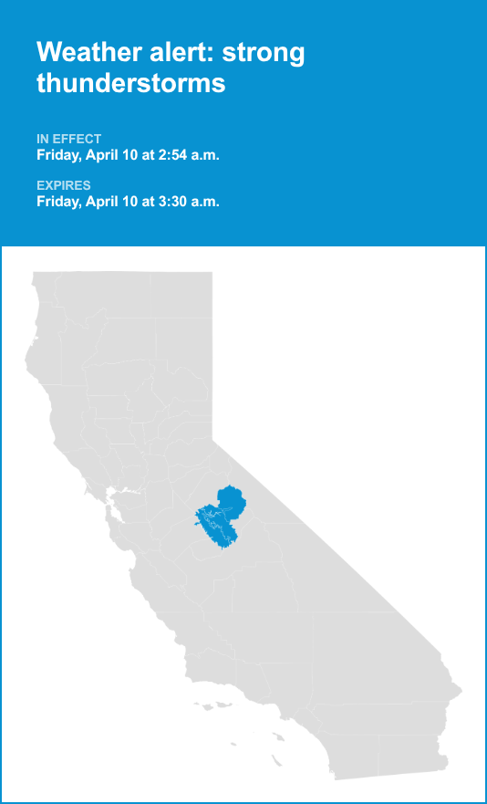 Yosemite, Yosemite Valley, Mariposa Madera Foothills and Mariposa-Madera Lower Sierra are included in a weather alert for strong thunderstorms by the National Weather Service on Friday at 2:54 a.m. The alert is in effect until 3:30 a.m.