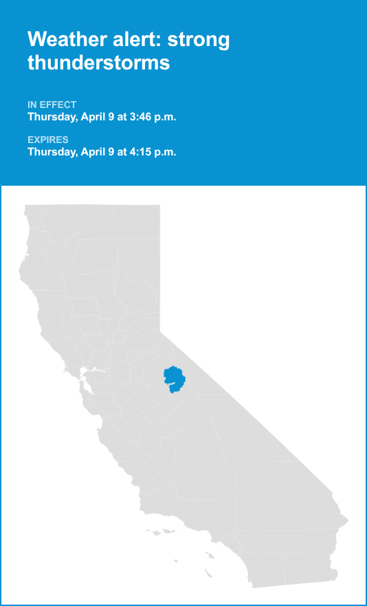 A weather alert was issued by the National Weather Service on Thursday at 3:46 p.m. for strong thunderstorms in effect until 4:15 p.m. for Yosemite.