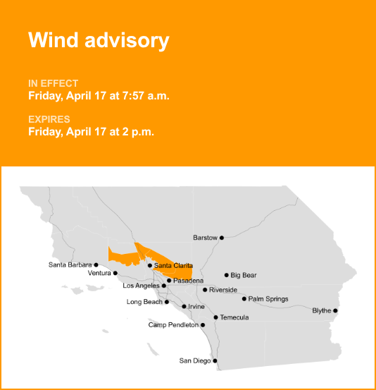 5 Freeway corridor near Santa Clarita, Southern Ventura County Mountains, Western San Gabriel Mountains/Highway 14 Corridor and Eastern San Gabriel Mountains are included in an updated wind advisory issued by the National Weather Service on Friday at 7:57 a.m. The advisory is in effect until 2 p.m.